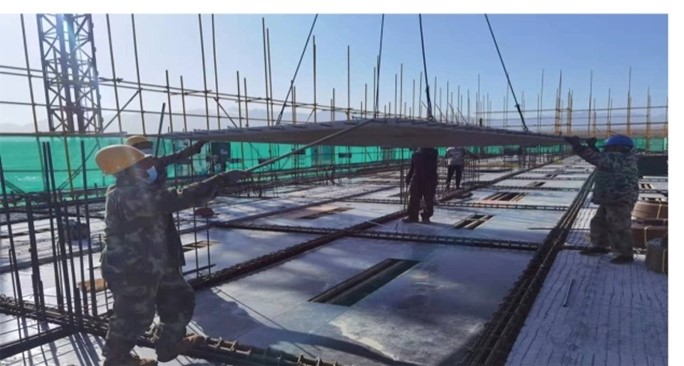 梁板鋼筋安裝完成后,進(jìn)行水電管線的敷設(shè)與連接工作,為便于施工,疊合板在工廠生產(chǎn)階段已將相應(yīng)的線盒及預(yù)留洞口等按設(shè)計(jì)圖紙預(yù)埋在預(yù)制板中。